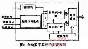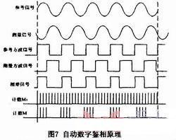 由于測量信號頻率較高,直接對其進行鑒相難以達到良好的鑒相精度,因而在系統中采用混頻的方法進行差頻鑒相。在差頻鑒相中,參考信號和測量信號同時與本振信號進行混頻,濾除混頻后高頻分量,得到混頻后低頻參考信號和混頻后低頻測量信號。混頻降低了信號頻率,但保持相位差不變,便于鑒相操作。相位差的檢測使用自動數字鑒相法。其原理如圖7所示。參考信號和測量信號通過過零比較,得到參考方波信號和測量方波信號。比較兩方波信號,得到兩者之間的相位差信號,然后使用高頻計數脈沖對相位差信號,然后使用高頻計數脈沖對相位差信號進行計數。設參考信號和測量信號的周期為f,高頻計數脈沖的頻率為fc,一個周期內的計數值為M,則相位差為:△φ=2πMf /fc。為了減小偶然誤差,提高鑒相精度,可以對多個周期計數求平均。設N個周期的計數值為M'',則△φ=2πM''f/Nfc。
