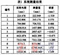 在實際測量中,利用組合測尺頻率先后進行兩次測量。第一次取主振信號頻率為52MHz,本振信號頻率為51.99MHz;第二次取主振信號頻率為51MHz,本振信號頻率為50.99MHz。對應于混頻后信號頻率為10kHz。FPGA中鑒相高速計數脈沖頻率為50MHz。基于以上參數,對多段光纖進行測量。兩次測量的結果進行分析比較,可得到測量值。被測光纖的實際光程已由精密反射儀通過光學方法進行標定。測量結果如表1所示。