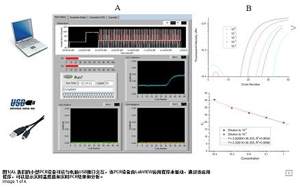 利用該系統同時運行包含預加載PCR反應物的三個聚合物,從抽樣到結果所花費時間不到一小時,并且允許采用大量生物的多樣性。利用熱敏電阻的實時溫度反饋,一個內部比例積分微分(PID)芯片來處理溫度控制。該控制器由一個補償器,輸出裝置和傳感器反饋信號組成,反饋信號對于控制加熱器輸出功率,以及保持溫度是很必要的。使用LabVIEW軟件,我們對圖形用戶接口進行編程,以顯示實時溫度,設置溫度,并且顯示來自三個通道的實時PCR結果 (如圖1A所示)。
