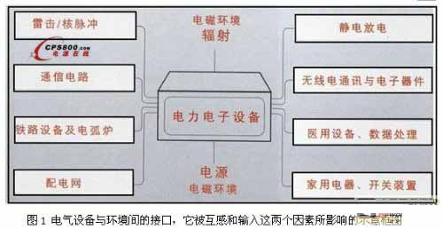 圖1表示出電氣設備與環境間的接口,它被互感和輸入這兩個因素所影響,實際上是兩個有線或無線設備之間的相互干擾。輸入可分為兩部分:在線干擾和無線于擾。浪涌是在解決電磁兼容性問題時產生的主要問題之一。在涉及到電能傳輸時,必須牢記以下品質因素:電壓等級、非線性變化、浪涌等級(浪涌的波峰涌)。