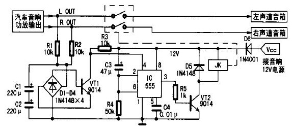 1.在接通音響電源的瞬間,因電容C3兩端電壓不能突變,可視為短路,則時基電路555的②、⑥腳電位高于2/3 Vcc,故555處于復(fù)位狀態(tài),③腳輸出低電平,晶體管VT2截止,繼電器JK常開觸點不動作。同時+12 V電壓通過電阻R4向電容C3充電,延時約5s(秒鐘)后555的②、⑥腳電位降低至1/3Vcc,555被觸發(fā)置位,③腳由低電平變?yōu)楦唠娖剑w管VT2導(dǎo)通,繼電器JK得電,常閉觸點閉合,從而實現(xiàn)了延遲一段時間將揚聲器接入功放,徹底消除了開機時大電流對揚聲器的沖擊;