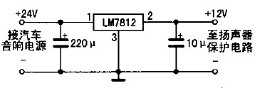 具體制作如下:先把功放輸出端與音箱的引線切斷,按圖2所示電路將引線頭a、b分別接功放的兩組輸出端,c、d分別接左、右聲道音箱:揚聲器保護電路的電源只能從收放機中獲取,不可直接從汽車12 v電源中獲取,否則不起開/關(guān)機保護作用;若是柴油車所配置的收放機(使用24 V電源),則要求增加一個降壓電路(見圖3所示),給揚聲器保護電路供電,以免電源電壓過高損壞IC。