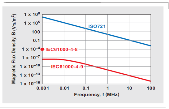 超出電容隔離器差動電路噪聲預算的磁耦合要求 1MHz 下大于 11.7 V•s/m2(117千高斯) 的磁通量密度。這需要在一個距離器件 0.1m 的導體中有超過 5 百萬安的電流才能產生這樣一個磁場。在自然界或者任何制造設備中這都是不可能存在的。如果的確存在,那么設計人員便可做以下情況假設:在隔離層失效以前,周圍的電路便都已失效。