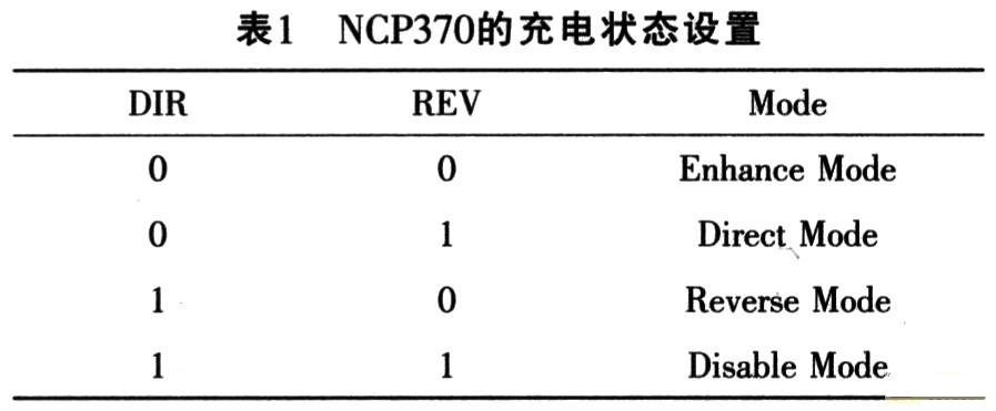 將NCP370的DIR端強制拉低,并將DEV端拉高,NCP370即可進入正向充電狀態。而將DIR端置高時,OUT端會與IN端斷開,具體的充電狀態設置如表1所列。另外,DIR也會受到OVLO或U-VLO故障的影響(FLAG有效)。