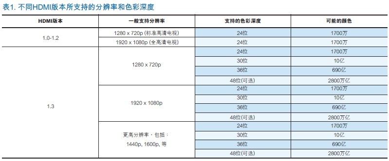 設計人員通常也註意到HDMI1.3規范指定的340MHz TMDS時鐘速率比數據或信號速率要慢的多。在標準的24位/像素的色彩深度下,通過TMDS對傳輸的數據等同於每像素30比特的編碼數。因此,三個TMDS通道的每一個通道都必須在一個“系統”時鐘周期內傳輸10比特。
