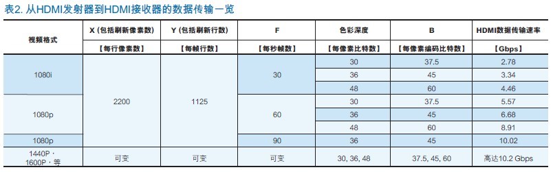 表1顯示了每種分辨率和相應的每行像素和每幀行數。對於表1列出的每一個色深,都有一個相應的為每個像素顏色而傳輸的編碼比特數。需要從HDMI發射器發送至HDMI接收器的數據量可以被解釋為這些變量之間的關係,包括更新屏幕所需的幀數。表2描述了這種關係: