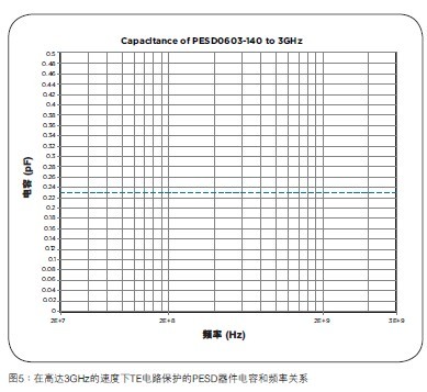 如圖5所示,TE電路保護的PESD器件在3GHz速度下具有穩定的電容和頻率關係。其行為非常類似於一個0.25pF(典型值)的電容,從而可以大大簡化設計。由於HDMI的TMDS對根據數據模式,視頻源的分辨率和色彩深度改變運行頻率,瞭解ESD保護器件的電容在很寬的頻率范圍內是穩定的特點可以為設計人員提供更多的自由度和靈活性。