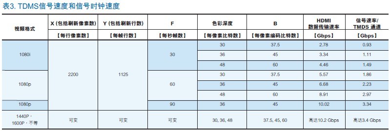 為了說明鏈路數據速率和物理TMDS對之間的關係,表3結合了表2中的信息與TMDS對信號速度,以及相應的信號時鐘速度。