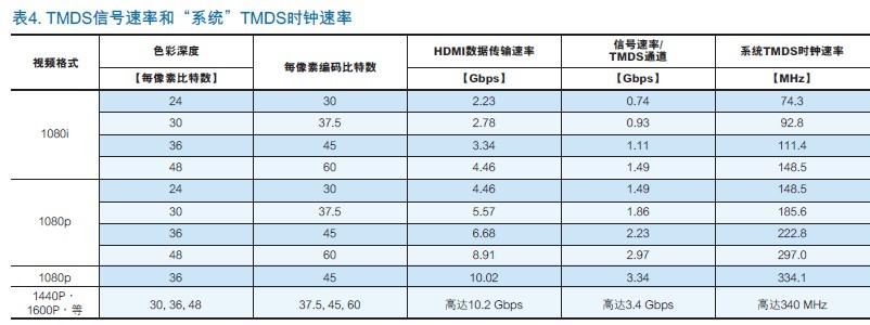 因而信號時鐘和數據傳輸率相當於“系統”TMDS時鐘速率的十倍。此外,對於更高的色彩深度,信號時鐘速率會更高,以適應傳輸更多每像素編碼比特數。表4中描述了鏈路數據速率、TMDS信號速率和“系統”TMDS時鐘速率之間的關係。