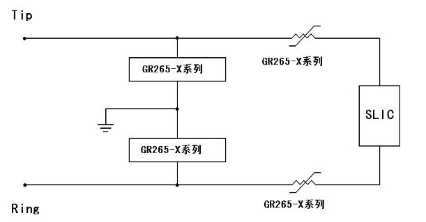 目前本公生產的GR265-X和GR600-X 等系列高分子PTC 熱敏電阻和半導體固體放電管一起用于總配線架的保安單元中,可以滿足過流和過壓保護的要求,同時幫助保安單元滿足中國通信行業標準 YD/T 694-1999-2002、北美 TelcordiaGR-974 及 ITU-T K.20 等標準,典型的使用電路如上圖所示。