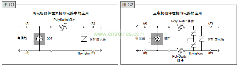 失效保護機構是安裝在位于氣體放電管中心電極焊塊上的短路簧片。如圖G12所示,在正常的工作條件下,焊塊使得彈簧片浮在外側電極之上。當長時間放電使氣體放電管溫度達到焊塊的熔點時,焊塊就會被軟化,促使短路彈片被激活,并與兩個外側電極搭接。這個過程導致三個電極之間永久短路,建立起一條低阻抗路徑,將故障電流引到地面,而不會產生顯著的熱量。