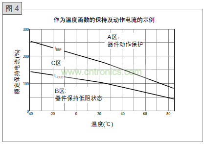 圖4說明了作為溫度函數的PolySwitch器件的保持和動作電流行為。可以為每個可用器件定義一條這樣的曲線。A區說明了PolySwitch器件將動作 (轉到高電阻狀態) 以保護電路時的電流和溫度的組合。B區說明了PolySwitch器件將允許電路正常操作的