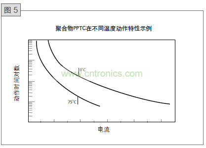 圖5顯示了在0℃和75℃下的靜止空氣中聚合PTC器件的一對典型運行曲線對。這些曲線是不同的,因為需要動作器件的熱量來自