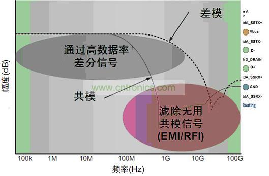 這些應(yīng)用中能使用共模濾波器(CMF)來消除不想要的共模噪聲,并防止高速信號(hào)輻射有害的共模噪聲信號(hào)至系統(tǒng)其它元件。同時(shí),CMF還使想要的高速數(shù)據(jù)事實(shí)上不受影響地通過。典型的CMF特性如圖4所示,圖中顯示消除了共模噪聲,同時(shí)支持差模信號(hào)無損通過。