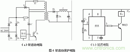 開關(guān)穩(wěn)壓電源的電路比較復(fù)雜,開關(guān)穩(wěn)壓器的輸入端一般接有小電感、大電容的輸入濾波器。在開機瞬間,濾波電容器會流過很大的浪涌電流,這個浪涌電流可以為正常輸入電流的數(shù)倍。這樣大的浪涌電流會使普通電源開關(guān)的觸點或繼電器的觸點熔化,并使輸入保險絲熔斷。另外,浪涌電流也會損害電容器,使之壽命縮短,過早損壞。為此,開機時應(yīng)該接入一個限流電阻,通過這個限流電阻來對電容器充電。為了不使該限流電阻消耗過多的功率,以致影響開關(guān)穩(wěn)壓器的正常工作,而在開機暫態(tài)過程結(jié)束后,用一個繼電器自動短接它,使直流電源直接對開關(guān)穩(wěn)壓器供電,這種電路稱之謂直流開關(guān)電源的 “ 軟啟動 ” 電路。如圖 4 ( a )所示在電源接通瞬間,輸入電壓經(jīng)整流橋( D1 ~ D4 )和限流電阻 R1 對電容器 C 充電,限制浪涌電流。當(dāng)電容器 C 充電到約 80 %額定電壓時,逆變器正常工作.經(jīng)主變壓器輔助繞組產(chǎn)生晶閘管的觸發(fā)信號,使晶閘管導(dǎo)通并短路限流電阻 R1,開關(guān)電源處于正常運行狀態(tài).為了提高延遲時間的準(zhǔn)確性及防止繼電器動作抖動振蕩,延遲電路可采用圖 4 ( b )所示電路替代 RC 延遲電路.。