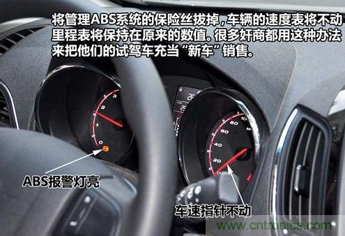 當(dāng)您新購(gòu)買(mǎi)車(chē)的時(shí)候發(fā)現(xiàn)車(chē)輛的里程表和車(chē)速表不工作時(shí)要注意了,因?yàn)楹芸赡苁羌樯贪涯?chē)輛管理ABS泵的保險(xiǎn)絲給拆下來(lái)了,這樣車(chē)輛還能正常開(kāi)但里程數(shù)不增加,而這也是很多奸商翻新試駕車(chē)后當(dāng)新車(chē)賣(mài)的常用手段。