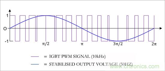 In simple inverters, two IGBT pairs are controlled in phase opposition by a PWM signal whose frequency is at least 10kHz. To achieve satisfactory efficiency, the switching edges must be very steep. Since the control signals are generated by microcontrollers, however, the edge angle istoo low to directly actuate the IGBTs. It is therefore necessary to install IGBT drivers that accelerate the switching process to around 1000V/µs. As the IGBTs tend to float at a high potential, the non-isolated control logics must be separated by means of optocouplers. In addition, the supply voltage of the driver, which is normally between +15V and -9V, must also be isolated. This is done through appropriately isolated DC/DC converters.