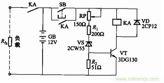 蓄電池深度放電,會使極板硫化,縮短蓄電池的使用壽命。為此可設置放電保護器。電路如圖所示。當蓄電池電壓下降到終止值(可由電位器RP來改變動作閾值),繼電器KA釋放,切斷負載回路,使蓄電池停止放電。