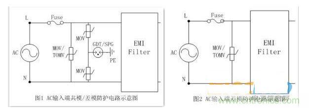 在交流電源AC輸入端浪涌保護方案,可以采用壓敏電阻(MOV) 或加氣體放電管(GDT/SPG)組合來進行設計。在有接地的情況下,可以采用如圖1差共模同時防護的理念,在L-N之間并聯壓敏電阻(MOV),可以有效地抑制差模所產生的浪涌過電壓,起到對后級電路保護,在L/N-PE之間分別采用MOV 或MOV+GDT/SPG對地的電路連接方式可以有效的將共模浪涌能量泄放到大地, 防止浪涌引入到后級電路而造成損壞;如果在電源沒有接地線情況下,如圖2則在L-N線間可直接并聯壓敏電阻進行差模防護即可。為了避勉MOV保護元件在防護失效之后,出現短路失效著火燃燒的可能性,可以使用TMOV或PMOV進行保護。針對上面 MOV交流耐受電壓選擇至少要高于線路最大交流工作電壓1.2~1.4倍,以避勉誤動作,在有同時使用放電管GDT/SPG時,放電管擊穿電壓的下限值必須至少高于電路的最大峰值電壓,耐受電流必須根據自身浪涌等級的需求選擇不同電流等級,以符合于浪涌測試標準的要求。