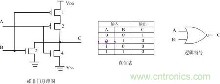 將上述“與非”門、“或非”門邏輯符號的輸出端的小圓圈去掉,就成了“與”門、“或”門的邏輯符號。而實現“與”、“或”功能的電路圖則必須在輸出端加上一個反向器,即加上一對CMOS管,因此,“與”門實際上比“與非”門復雜,延遲時間也長些,這一點在電路設計中要注意。