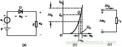 圖(a)電路(b)二極管伏安特性和工作點Q(c)二極管的直流電阻
