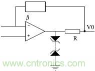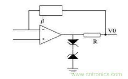 (3)輸出保護(hù)。當(dāng)集成運(yùn)放過載或輸出端短路時(shí),若沒有保護(hù)電路,該運(yùn)放就會(huì)損壞。但有些集成運(yùn)放內(nèi)部設(shè)置了限流保護(hù)或短路保護(hù),使用這些器件就不需再加輸出保護(hù)。對(duì)于內(nèi)部沒有限流或短路保護(hù)的集成運(yùn)放,可以采用下圖所示的輸出保護(hù)電路。在下圖電路中,當(dāng)輸出保護(hù)時(shí),由電阻R起限流保護(hù)作用。