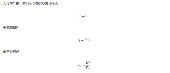 (2)電流表外接時,電流表讀數為負載電流和電壓表電流之和,電壓表讀數即為負載電壓,因此儀器的測量結果中包含了電壓表的損耗功率PU。