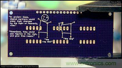 下面是一位自稱“johngineer”的網(wǎng)友作品,這家伙的網(wǎng)站有不少很酷的東西(例如一只他自 己做的超酷龐克風(fēng)手表),還有非常專業(yè)的技術(shù)文章。“johngineer”沒有解釋這個電路板的作用,但他在上面印了兩段文字,想象未來如果有考古學(xué)家挖到這片電路板,會怎么解讀這種“文物”?