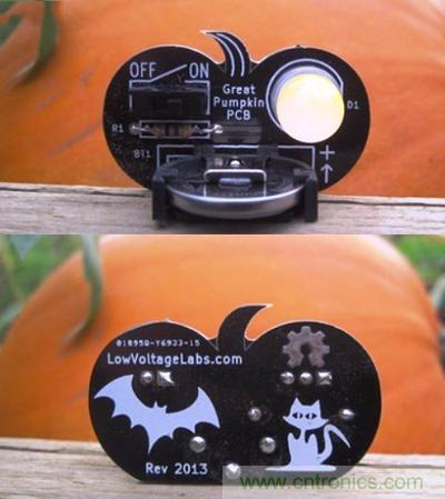 這是low voltage labs開發(fā)的南瓜PCB,除了形狀很可愛,還印了可愛的圖案;這款電路板上面有LED燈泡,就是讓你在萬圣節(jié)放進南瓜燈,不必擔(dān)心蠟燭會被風(fēng)吹熄….其實直接當成擺飾也很有味道,而且只要6美元就買得到!