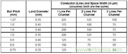 一旦完成了Dog bone型扇出,并且確定了特定的過孔焊盤尺寸,第二步就是定義從BGA進入電路板內層的走線寬度。確認走線寬度時要考慮許多因素。表1顯示了走線寬度。走線之間要求的最小空間限定了BGA迂回布線空間。重要的是要知道,減小走線之間的空間將增加電路板制造成本。