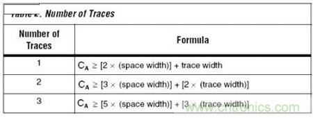 兩個過孔之間的區域被稱為走線通道。相鄰過孔焊盤之間的通道面積是信號布線必須經過的最小面積。表1用來計算可以經過這個區域布線的走線數量。
