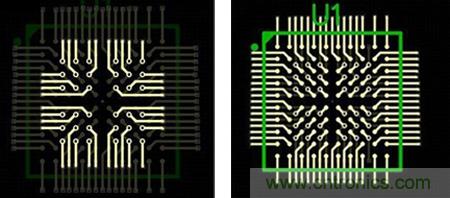 圖7a和7b:焊盤內過孔用于內部,而外部引腳在0.5mm柵格上扇出。圖7a顯示的是頂層;圖7b顯示的是頂層和內部布線層。