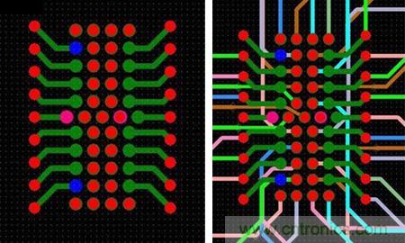 圖6所示的扇出方法避免了使用高端技術,而且不影響信號完整性。BGA引腳被分成內部和外部引腳兩個部分。焊盤內過孔用于內部,外部引腳在0.5mm柵格上扇出。圖7a顯示的是頂層,圖7b顯示的是頂層和內部布線層。