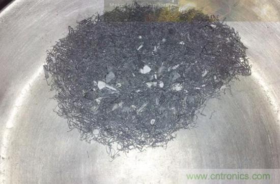 ▼ 重復幾次上面的步驟,直到把電路芯片灰中的金屬全部分離出來。