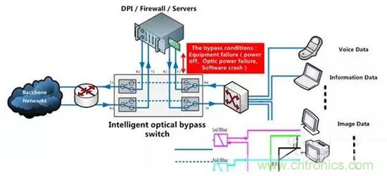 OBP旁路保護系統: 光旁路保護系統(Optical Bypass Protection system)是一種應用于光纖通信領域并能自動繞過故障網絡節點的智能光路切換系統,能自動識別網絡節點供電狀態及光信號輸出狀態,當本地光設備出現故障(包括電源中斷、硬件或軟件故障等)后,能夠瞬間切換到旁通光路,通訊線路將繞過本地設備(即故障節點),從而能避免由于該故障節點而發生全阻障礙,保證系統連通正常。