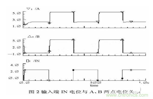 實(shí)際上,B點(diǎn)電位與負(fù)載電容和電容Cboot的大小有關(guān),可以根據(jù)設(shè)計需要調(diào)整。具體關(guān)系將在介紹電路具體設(shè)計時詳細(xì)討論。在圖2中給出了輸入端IN電位與A、B兩點(diǎn)電位關(guān)系的示意圖。