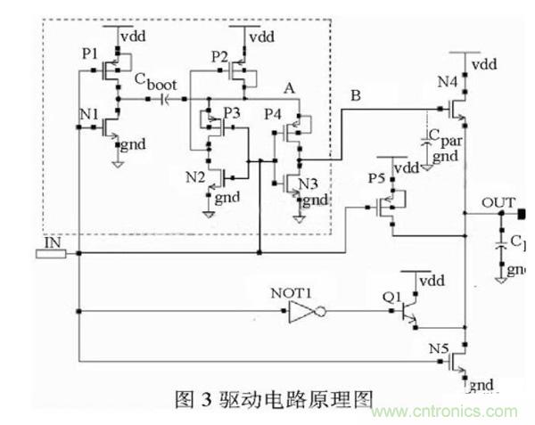圖3中給出了驅(qū)動電路的電路圖。驅(qū)動電路采用Totem輸出結(jié)構(gòu)設(shè)計,上拉驅(qū)動管為NMOS管N4、晶體管Q1和PMOS管P5。下拉驅(qū)動管為NMOS管N5。圖中CL為負(fù)載電容,Cpar為B點(diǎn)的寄生電容。虛線框內(nèi)的電路為自舉升壓電路。