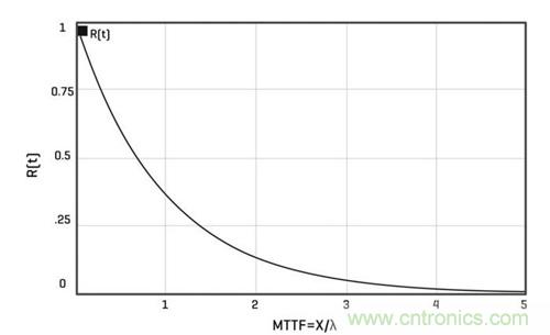 這是因?yàn)?,具有恒定故障率的故障由一個(gè)指數(shù)因子表征,如以下等式所示,用于計(jì)算元器件在給定時(shí)間后沒(méi)有發(fā)生故障的可能性:R(t) = e-λt