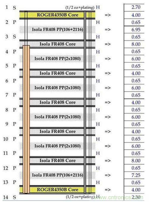 在混合疊層情形下,可以輕松地使用通用制造工藝技術將Rogers和高性能FR4混合在一起使用,因此也相對容易實現高的制造良率。Rogers疊層不需要專門的過孔準備工序。