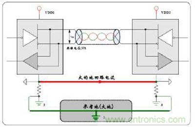 干擾不但影響信號,更嚴重的會導致板子死機或者燒毀,所以接口和電源的隔離是抗干擾的第一條“軍規”.隔離的主要目的是:避免地回流燒毀電路板和限制干擾的幅度,保護控制器不死機。如圖3所示,為未隔離時,兩個節點的地電位不一致,導致有回流電流,產生共模信號,CAN的抗共模干擾能力是-12~7V,超過這個差值則出現錯誤,如果共模差超過±36V,燒毀收發器或者電路板。