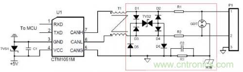 增加隔離后,是否萬事大吉了?肯定不是,隔離只是阻擋,如果干擾強度很高,比如達到2KV浪涌,隔離也會被破壞。所以要想達到更高的防護等級,必須增加防浪涌電路。如圖6所示,為致遠電子高速總線標準防浪涌保護電路。