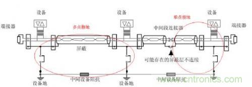 使用屏蔽線后,在屏蔽層沒有良好接大地前,屏蔽線是不起作用的。所以我們要選擇一種接地方式。通常來說,屏蔽層單點接地可以避免地回流(不同位置的地電位不同而導致的產生電流)、多點接地可以加快高頻干擾信號的泄放。所以要根據實際情況選擇合適的接地方式。如圖11所示。