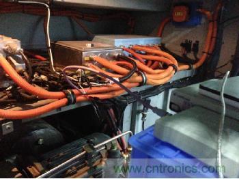 遠離干擾源是最簡單的抗干擾方法,如果CAN線與強電干擾源遠離0.5米,干擾就基本影響不到了。可是在實際布線中,經常遇到空間太小而不得不和強電混在一起,如圖12所示,為某新能源汽車的驅動系統,CAN線與驅動線混在一起,結果導致干擾很大。只要與CAN并行的驅動線,具備2A/秒的電流變化,就會耦合出強磁場而導致CAN線上出現干擾脈沖。所以CAN線必須要和電流會劇烈變化的線纜遠離。比如繼電器、電磁閥、逆變器、電機驅動線等。