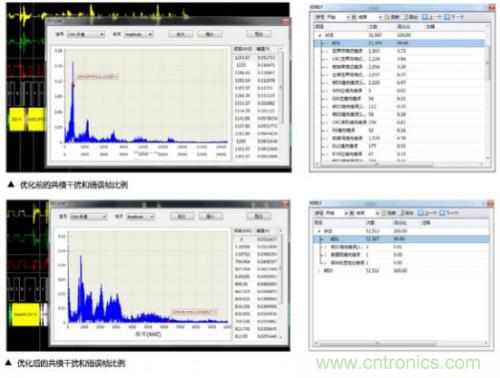 磁環的效果可以大大削減特定頻率的干擾強度,在增加磁環前,需要用CANScope或者示波器FFT快速傅里葉變化功能,測試出最高干擾的頻率,然后向磁環廠家定制對應頻率的磁環。如圖14所示。為增加磁環前和增加磁環后的FFT的結果??梢钥闯龈蓴_強度明顯減小。