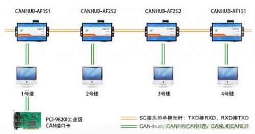 抗干擾的終極手段就是把CAN轉化為光纖傳輸,光纖是一種無法被電磁干擾的傳輸介質。如果前5種抗干擾手段均無法解決干擾問題,可以把CAN轉化為光纖,實現“無懈可擊”。如圖15所示。為使用致遠電子的CANHub-AF1S1和CANHub-AF2S2組合的光纖主干網絡。