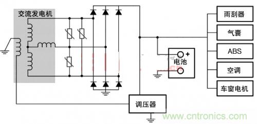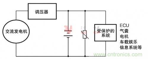 圖3.MOV對(duì)汽車(chē)子系統(tǒng)供交流發(fā)電機(jī)瞬態(tài)保護(hù)