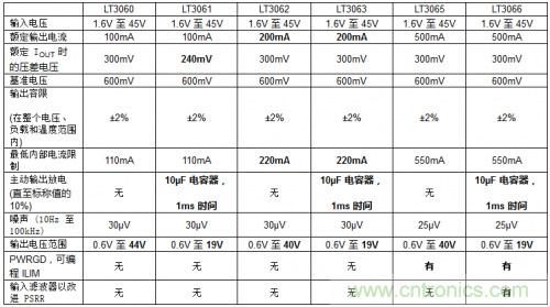 表 1:LT306x 系列 LDO 功能和特點一覽