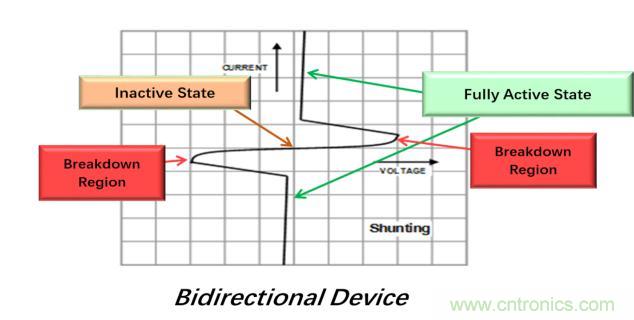 TISP的非線性電壓-電流特性通過轉移產生的電流來限制過壓。作為晶閘管,TISP具有非連續電壓-電流特性,它是由于高電壓區和低電壓區之間的切換動作而導致的。在TISP器件切換到低電壓狀態之前,它具有低阻抗接地路徑以分流瞬變能量,雪崩擊穿區域則導致了箝位動作。