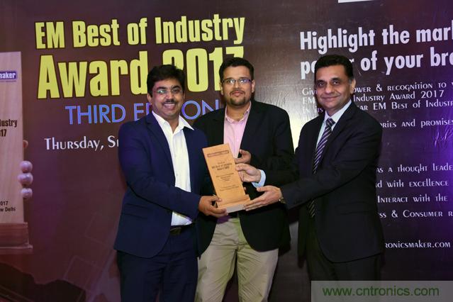 圖片說(shuō)明:印度銷售經(jīng)理Bharat Kapoor(左)以及印度和南非現(xiàn)場(chǎng)應(yīng)用經(jīng)理Navneet Vinaik(中)接受EM行業(yè)最佳獎(jiǎng)的“最佳電路保護(hù)組件獎(jiǎng)”。