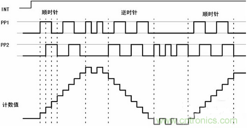 方向盤轉角傳感器的輸出為正交編碼脈沖。正交編碼脈沖包含兩個脈沖序列,有變化的頻率和四分之一周期(90°)的固定相位偏移,如圖1所示。通過檢測2路信號的相位關系可以判斷為順時針方向和逆時針方向,并據此對信號進行加/減計數,從而得到當前的計數累計值,也即方向盤的絕對轉角,而轉角的變化率即角速度,則可通過信號頻率測出。另外,方向盤轉角傳感器有一個零位輸出信號,當方向盤在中間位置時,該信號輸出0V,否則輸出5V,通過該信號,可對絕對轉角進行在線校準。